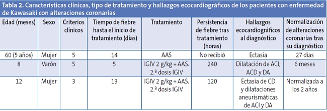 En relación con el tratamiento, la paciente A no fue tratada con IGIV. Recibió únicamente AAS a dosis antiagregante durante tres meses. El paciente B fue tratado con IGIV a 2 g/kg/dosis única tras cinco días de haber comenzado con el cuadro febril, con AAS a dosis antiinflamatorias durante 23 días y posteriormente a dosis antiagregante durante 6,5 meses. Persistió la fiebre 240 horas desde el inicio del tratamiento, por lo que necesitó retratamiento con IGIV. Finalmente, la paciente C fue tratada con IGIV a 2 g/kg/dosis única tras 13 días de haber comenzado con el cuadro febril, con AAS a dosis antiinflamatorias durante tres días y a dosis antiagregante durante 36 meses. Presentó fiebre 120 horas desde el inicio del tratamiento, por lo que necesitó retratamiento con IGIV.