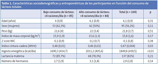 Se encontró una mayor ingesta energética total en el grupo que refería un mayor consumo elevado de lácteos (leche y derivados). Sin embargo, el resto de las variables, incluidas las medidas antropométricas, no eran significativamente diferentes entre los grupos de comparación. El z-score calculado para los niños de la muestra (z = -0,1) refleja que los participantes tenían un IMC acorde al esperado para su edad y sexo.