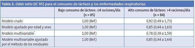 Material y métodos: estudio transversal con 169 voluntarios de entre 4 y 7 años. Información recogida mediante cuestionarios en papel. Información dietética recogida mediante cuestionario de frecuencia de consumo de alimentos semicualitativo de 151 ítems. Se valoró la asociación de determinadas enfermedades respiratorias (otitis media aguda, sinusitis, mastoiditis, neumonía) con el consumo de leches, quesos y yogures, comparando dos categorías de consumo definidas a partir de la mediana de cada alimento, mediante regresión logística multivariable.