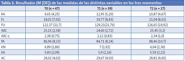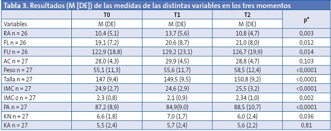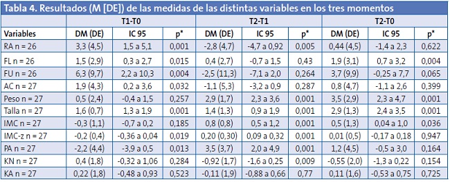 En relación con el periodo “finalización de la intervención (T1)” con respecto al “basal (T0)” se produjeron incrementos en la fuerza, la resistencia aeróbica, la flexibilidad y la talla, así como disminución del perímetro abdominal. Sin embargo, a los tres meses de seguimiento posintervención (T2) con respecto al momento T1, se produjeron disminuciones en la resistencia aeróbica y de la puntuación del cuestionario Kreceplus-Nutrición e incrementos en el peso, el IMC (y su distribución-z) y el perímetro abdominal, continuando el aumento de la talla. Los cambios observados entre la evaluación en T2 respecto a la situación basal, T0, fueron aumentos en la flexibilidad, peso y talla.