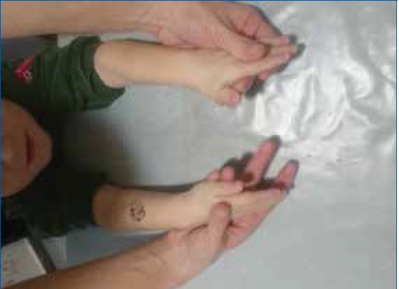 Paciente varón de 2 años que acude a la consulta de Pediatría de Atención Primaria porque las profesoras, en su escuela infantil, notan cierta dificultad, desde hace tiempo, a la hora de coger los cubiertos para comer. No presentaba dolor ni ninguna otra sintomatología.