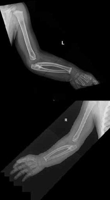 Se solicitó una radiografía de ambos brazos (Fig. 2) en la que se observó sinostosis radiocubital bilateral a nivel proximal, con ligera deformidad y subluxación de ambas cabezas femorales e incurvación diafisaria en los radios.