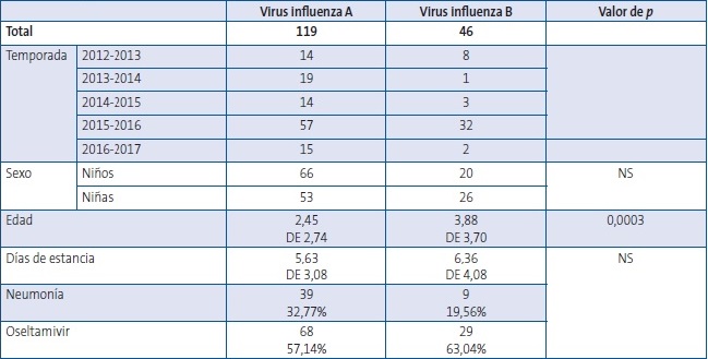 Los casos se correspondieron a 86 niños (51,8%) y 79 niñas, sin encontrar diferencias según el sexo entre los distintos serotipos de virus influenza. La edad media de los niños hospitalizados fue de 2,86 años (desviación estándar [DE]: 3,05). Hubo 59 niños menores de 12 meses, que se corresponde al 35,54% del total.