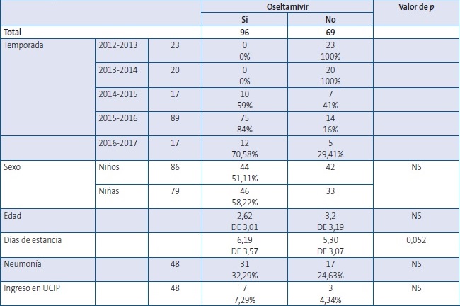 Resultados: Se han estudiado 166 pacientes. El porcentaje de ingresos sobre el total de ingresados en las mismas fechas osciló entre el 2,03 y el 9,69%. El mayor número de ingresos fueron en la penúltima temporada de estudio (p<0,0001). Los niños diagnosticados de gripe A presentaron una edad menor que los que lo fueron de gripe B (2,45 frente a 3,88 años, p<0,0001), no encontrándose diferencias significativas en cuanto al sexo, los días de estancia media, la necesidad de antibioterapia o de broncodilatadores. Recibieron tratamiento con oseltamivir un total de 96 niños (57,83%), 75 de ellos en la temporada 2015-2016. No se encontraron diferencias en las características de los niños que lo recibieron frente a los que no. La estancia media global fue 0,89 días mayor en aquellos niños que recibieron el antiviral, diferencia casi significativa en el total de la muestra ( p = 0,052), durante la temporada 2015-2016 la duración fue 1,8 días mayor (p = 0,039). No se encontraron diferencias significativas en cuanto al porcentaje de pacientes con neumonía ni de los que precisaron ingreso en la Unidad de Cuidados Intensivos Pediátricos entre los tratados respecto a los no tratados.