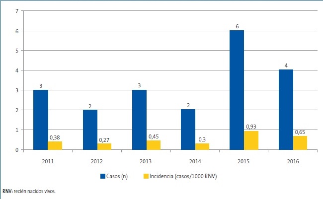 La población susceptible estimada fue de unos 41 084 recién nacidos durante el periodo de estudio, en nuestro caso correspondiente a los nacidos en las maternidades de un hospital de segundo y tercer nivel, ambos centros hospitalarios del sistema sanitario público del área de influencia de nuestra muestra. Cumplieron criterios del estudio 20 casos de entre los 22 neonatos dados de alta con el diagnóstico codificado de deshidratación hipernatrémica; dos sujetos fueron excluidos por presentar patología desencadenante (hipercoagulabilidad, infección del tracto urinario [ITU]). La incidencia promedio durante el periodo de estudio fue de 0,5 por cada 1000 RN/año, desglosada por años en la Fig. 1, siendo máxima en el año 2015 (0,93 por 1000 RN/año) y mínima en el año 2012 (0,27 por 1000 RN/año).