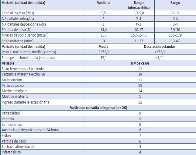 Resultados: la población susceptible estimada fue de 41 084 recién nacidos. Cumplieron criterios 20 casos. Alimentación con lactancia materna exclusiva 19/20, primer hijo en 14/20 familias, con mediana de edad materna 34 años (rango intercuartílico: 31-37). Los motivos de consulta más frecuentes fueron pérdida de peso, ictericia e irritabilidad. La mediana de edad al ingreso fue de 5,5 días (rango intercuartílico: 3,3-9,8), con porcentaje de peso perdido 14,4% (rango intercuartílico: 10-17) y natremia mediana 157,25 mEq/L (rango intercuartílico: 152-157,8). La estancia media fue de 6,5 días (rango intercuartílico: 4-8,75), 2/20 precisaron cuidados intensivos. No registramos fallecimientos o complicaciones graves.