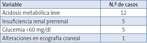 La mediana para la cifra de sodio en sangre fue de 157,25 mEq/l (RIQ: 152-157,8). Presentaron acidosis metabólica leve 12 de ellos (60%), con cifras medianas de pH en la muestra de 7,34 (RIQ: 7,29-7,35) e hipoglucemia en cinco (25%) con cifras medianas de glucemia en la muestra de 65 mg/dl (RIQ: 53-82). La cifra mediana de creatinina en nuestra serie fue de 0,62 mg/dl (RIQ: 0,53-0,73). Se realizó ecografía craneal en 12 (60%) de los neonatos –bien por somnolencia excesiva (siete de ellos) o bien por irritabilidad (cinco)–, presentando alteraciones en la prueba tan solo uno de ellos –leve hiperecogenicidad en núcleos de la base de forma bilateral, con posible edema–; aunque no se efectuó prueba de imagen de control, la evolución neurológica de este paciente fue satisfactoria. Los datos recogidos en otras pruebas complementarias se reflejan en la Tabla 2.
