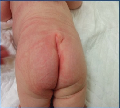 Lactante varón de 1,5 meses remitido a consultas externas hospitalarias desde el centro de salud para estudio de fosita en zona sacra junto con desviación de pliegue interglúteo, observados durante la revisión del mes de vida.