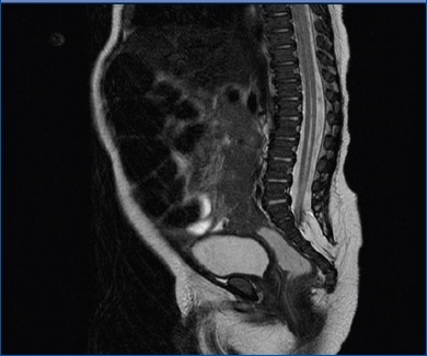 Figura 2. RM lumbosacra, corte sagital en T2. Lipoma que se extiende desde tejido celular subcutáneo hasta cono medular. Dilatación del canal centromedular