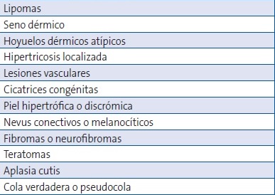 Existen muchas alteraciones cutáneas asociadas al DEO (Tabla 1)1,3. Normalmente se presentan en un 70% de los niños con DEO, son múltiples y aparecen en la línea media posterior a nivel de la lesión subyacente. Sin embargo, pueden aparecer aislados, en la línea media de la cabeza o en cualquier lugar del raquis, medial o paramedial al mismo4. Estos estigmas cutáneos son con relativa frecuencia la única manifestación de DEO. Pueden ser muy sutiles o incluso no existir en un principio, de ahí la enorme importancia de detectarlos precozmente en una exploración rutinaria.