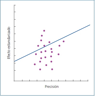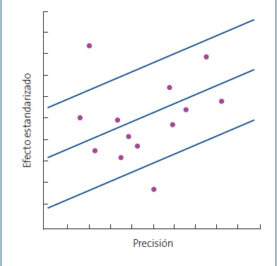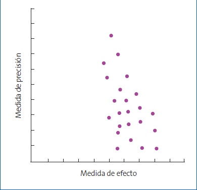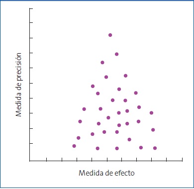 La más usada es el gráfico en embudo o funnel plot (Fig. 3). En él se representa la magnitud del efecto medido (eje X) frente a una medida de precisión (eje Y), que suele ser el tamaño muestral, pero que puede también ser el inverso de la varianza o el error estándar. Se representa cada estudio primario con un punto y se observa la nube de puntos12.