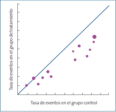 Quizás el más utilizado sea el gráfico de Galbraith8 (Fig. 1), que puede emplearse tanto para ensayos clínicos como para metaanálisis de estudios observacionales. Este gráfico representa la precisión de cada estudio frente a su efecto estandarizado junto con la línea de la ecuación de regresión ajustada y unas bandas de confianza. La posición de cada estudio respecto al eje de la precisión indica el peso de su contribución al resultado global, mientras que su localización fuera de las bandas de confianza indica su contribución a la heterogeneidad. Otra herramienta para metaanálisis de ensayos clínicos es el gráfico de L’Abbé9 (Fig. 2), que representa las tasas de respuesta de los grupos de tratamiento y de control y su posición respecto a la diagonal. Por encima de la diagonal quedan los estudios con resultado favorable al tratamiento, mientras que por debajo están aquellos con resultado favorable al control. Los estudios suelen representarse con un área proporcional a su precisión y su dispersión indica heterogeneidad. Hay que tener en cuenta que este método es aplicable solo a metaanálisis de ensayos clínicos y cuando la variable dependiente es dicotómica.