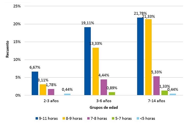 Figura 2. Relación entre edad y horas de sueño. Se observa que a mayor edad va disminuyendo la proporción de horas consideradas como patológicas (<7 horas)