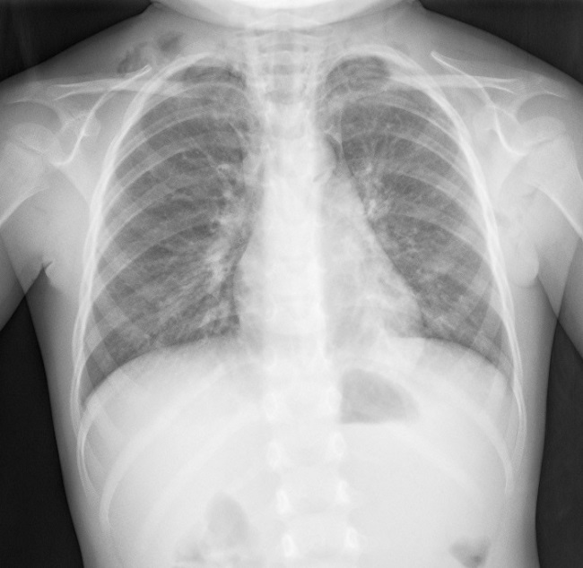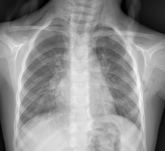 Se realiza una radiografía de tórax (Fig. 1) en la que se aprecia un enfisema subcutáneo en la región supraclavicular derecha y un neumomediastino que se ve reflejado como aire ectópico alrededor del botón aórtico. Se deriva a la paciente a Urgencias del hospital de referencia, donde se mantiene en observación mientras se inicia tratamiento de broncoespasmo agudo con broncodilatadores en aerosol y prednisolona (a dosis de 2 mg/kg), así como oxigenoterapia con gafas nasales a 1 lpm. Al presentarse en época epidémica, se extraen test rápidos de influenza A y B, con resultado negativo; y de VRS, con resultado positivo.