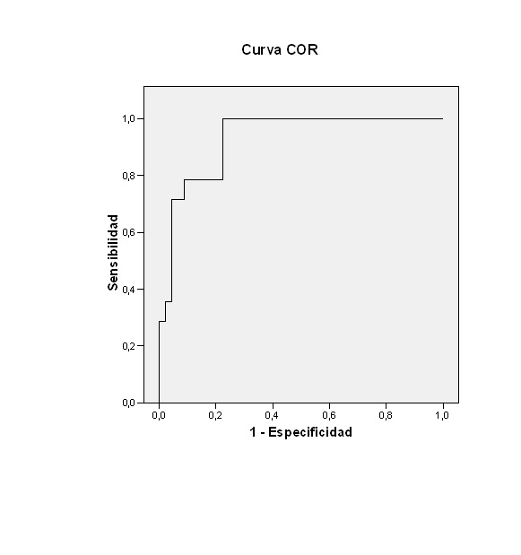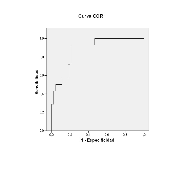 Las Figs. 1 y 2 recogen las curvas característica operativa del receptor (COR) de los valores obtenidos en la regresión lineal múltiple para los ingresos totales ABC = 0,884 (IC 95: 0,795 a 0,973; p <0,0001) y los ingresos por patología respiratoria por encima de la media, ABC = 0,929 (IC 95: 0,864 a 0,994; p <0,0001).