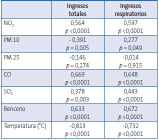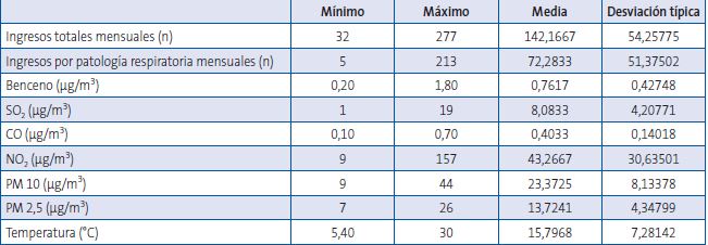 En la Tabla 1 se muestra el análisis descriptivo de las variables incluidas en nuestro trabajo. La media de ingresos por mes fue de 146 en los ingresos totales y de 74 en los ingresos respiratorios. Se observa una gran variabilidad entre los valores mensuales del número de ingresos totales y respiratorios y del nivel de los contaminantes (como se observa en la diferencia entre los valores máximo y mínimo de todas estas variables). La Tabla 2 recoge los coeficientes de correlación de Spearman encontrados entre los contaminantes, la temperatura y los ingresos totales y respiratorios. El NO, el CO, el benceno y la temperatura presentaron coeficientes de correlación con una significación estadística <0,0001 (en el último caso negativa) SO y partículas materiales con un diámetro < 10 (PM 10) también tuvieron correlaciones con significación estadística (en el segundo caso, PM10 negativa) y solo las partículas materiales con un diámetro <2,5 (PM 2,5) no tuvieron correlación con ninguno de los dos tipos de ingresos analizados.