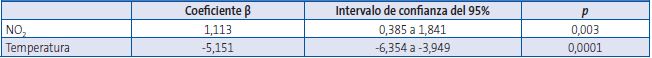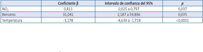 Posteriormente se realizó un análisis multivariante mediante regresión lineal múltiple, partiendo del modelo máximo y retirando de una en una las variables que no tenían significación estadística ( p <0,05). Se calculó el número de ingresos evitables si los niveles de NO no hubieran superado los 40 g/m 3