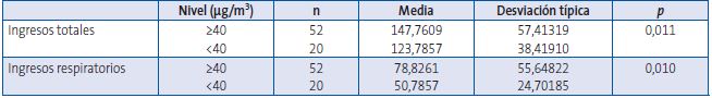Se constató que los meses en los que los niveles de NO eran igual o superiores a 40 μ/m 3 el porcentaje de ingresos fue mayor de manera significativa que el de los meses en que no se alcanzaron estos niveles.