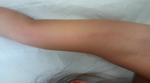 Caso 2. Niña de cinco años que consulta tres días después de la picadura de un insecto en el antebrazo izquierdo. En la exploración se observa y se palpa eritema tubular, indurado, no doloroso a la palpación, que se extiende desde el antebrazo hasta la axila ( Fig. 2). No se palpan adenopatías. La niña presenta un excelente estado general, sin fiebre. Se inicia tratamiento antibiótico con amoxicilina-clavulánico por vía oral, con buena evolución de la lesión.