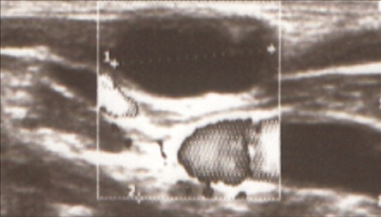 Ecografía en la que se observan múltiples adenopatías (imágenes ovaladas, menores de 1 cm, con hilio central y bordes bien definidos), y en el tercio distal del esternocleidomastoideo, una imagen anecogénica ovalada, de bordes bien definidos, sin flujo con Doppler