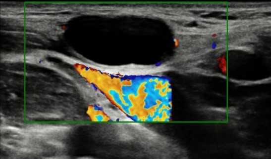 Ecografía Doppler que confirma la presencia de una lesión quística en el espesor del esternocleidomastoideo derecho, que podría corresponder a un quiste del segundo arco branquial atípico, sin poder descartar malformación vascular de bajo flujo tipo línfática macroquística unilocular