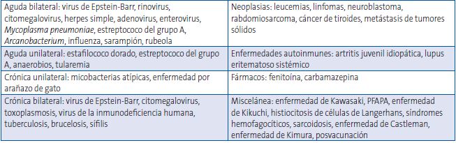 En la infancia es habitual el aumento de tamaño de los ganglios linfáticos, por la hiperplasia del tejido linfoide, con una respuesta aumentada a estímulos antigénicos y una mayor frecuencia de infecciones. Aunque habitualmente se trata de procesos benignos y autolimitados, es conveniente tener en cuenta otras causas menos frecuentes de adenopatías ( Tabla 1) y también considerar otros procesos con los que establecer el diagnóstico diferencial 3.
