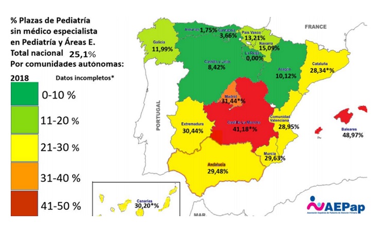 La situación actual de la Pediatría de Atención Primaria (PAP) es delicada. La Asociación Española de Pediatría de Atención Primaria (AEPap) en 2018 ha realizado un estudio de las necesidades y características de las plazas de PAP en España 1, donde se observa que un 25,1% de los niños no son atendidos por pediatras en el primer nivel asistencial. Como podemos ver en la Fig. 1, aunque la media sea del 25,1%, hay regiones como Castilla-La Mancha (41,18) y Baleares (48,97) que se acercan al 50%, y regiones tan importantes como Madrid que supera el 30%.
