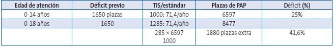 El aumento de la edad pediátrica de los 14 a los 18 años, si desde un punto de vista teórico podría ser positivo al incorporar a la Pediatría el periodo de la adolescencia, en la situación actual causaría un grave problema a la PAP. Teniendo en cuenta un cupo estándar de 1000 niños, tendríamos 285 niños más por pediatra. Si queremos mantener el mismo cupo estándar previo de 1000 TSI/PAP, serían necesarios 1880 plazas más de Pediatría, que en el caso de que se crearan no habría PAP para poder ocuparlas con lo que pasaríamos del actual déficit del 25,1% de especialistas en PAP (1650 plazas) a un déficit del 41,6% (1650 + 1880 = 3530), con lo que la PAP habría dado un paso decisivo hacia su desaparición ( Tabla 1).