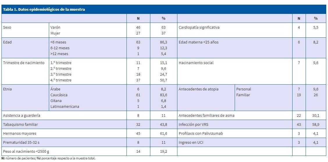 En la Tabla 1 se recogen los factores de riesgo y datos epidemiológicos de los pacientes. Ningún paciente de nuestra muestra tenía antecedente de prematuridad menor de 32 semanas, malformación pulmonar, fibrosis quística, inmunodeficiencia, displasia broncopulmonar, enfermedad neuromuscular o metabólica.