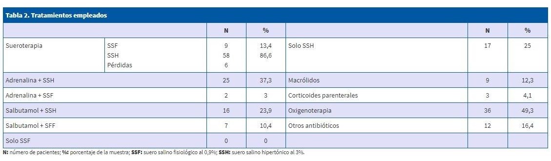 Results: we included 67 out of the 73 patients admitted with bronchiolitis in the analysis, of who 9 received physiological saline and 58 hypertonic saline, with or without an added bronchodilator. The mean length of stay was 6.07 ± 3.12 days in the physiological saline group and 6.67 ± 4.36 days in the hypertonic saline group. The mean severity score (Wood-Downes scale modified by Ferrés) was 3.67 ± 1.1 in the physiological saline group versus 3.16 ± 1.1 in the hypertonic saline group. In the second phase of the study, we found a readmission rate of 8.2%.