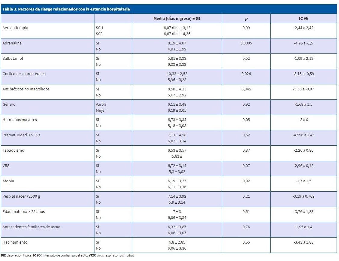 Materials and methods: we conducted a prospective observational study to assess the effectiveness of 3% hypertonic saline compared to physiological saline in the inpatient management of bronchiolitis, understood as the achieved reductions in length of stay and clinical severity scores. In a second phase, we analysed the risk factors associated with readmission due to bronchospasm in the same sample of patients.