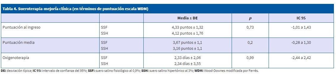 Se ha estudiado la efectividad del SSH y del SSF. En la Tabla 4 se observa que no existen diferencias estadísticamente significativas en ambos sueros en términos de reducción de la sintomatología de bronquiolitis, mediante la medición de la puntuación de la escala clínica (Wood-Downes modificada por Ferrés) al ingreso y diarios; y días en los que se ha precisado oxigenoterapia.