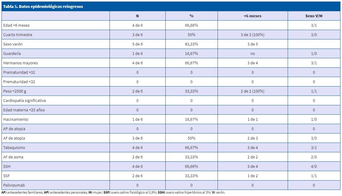 En nuestra muestra, de los 73 pacientes que ingresaron inicialmente, seis de ellos reingresaron, lo que nos da una tasa de reingreso del 8,2%, ligeramente superior. Los factores epidemiológicos más frecuentemente implicados en el reingreso en nuestra muestra fueron el sexo varón, la edad <6 meses, el tabaquismo familiar y la existencia de hermanos mayores.