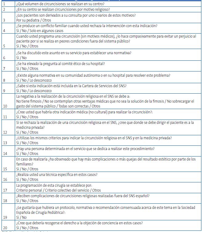 Introduction: the performance circumcision for cultural or religious reasons is a practice whose indication is not well defined within the scope of medical practice in Spain. The objective of this study was to illustrate the variability in its practice in Spain with the purpose of eventually establishing a general protocol on the subject.