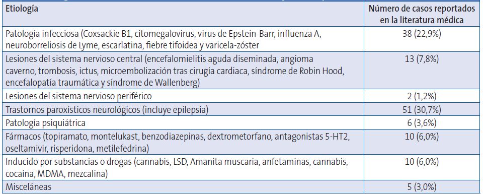 En cuanto a la etiología según una reciente revisión sistemática se han descrito 170 casos9, los cuales se han agrupados en ocho grupos (Tabla 1). Hay que remarcar que dentro de la patología infecciosa, la mononucleosis infecciosa representa el mayor porcentaje, con 26 casos (15,7%). El diagnóstico diferencial estaría enfocado a la etiología de base que, como se muestra en la tabla, es muy extensa. En cuanto al pronóstico y tratamiento, la mayoría de los casos no clínicos y clínicos de SAPM se consideran benignos, en el sentido de que la remisión completa de los síntomas a menudo se puede obtener, a veces espontáneamente y en otros casos después de un tratamiento adecuado. Sin embargo, en casos clínicos con una enfermedad crónica subyacente (como migraña y epilepsia), los síntomas tienden a reaparecer en concordancia con las fases activas de la enfermedad, y en casos de encefalitis, el pronóstico también puede variar. Nuestro caso se enfocó en la etiología más habitual del SAPM y datos clínicos asociados en la paciente, confirmando el diagnóstico de mononucleosis infecciosa como etiología del SAPM, con tratamiento sintomático el cuadro clínico cedió.