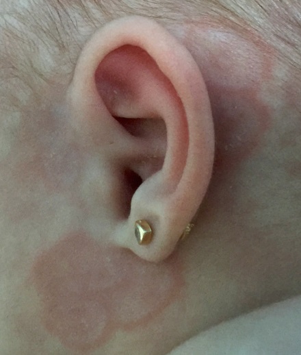 En la exploración física, buen aspecto general, eupnéica, activa y reactiva con buen tono. Lesiones dérmicas maculopapulosas en la cara, circinadas, con forma redondeadas, aclaramiento centrípeto, cuyo borde eritematoso parece descamativo, con distribución en región frontal, retroauricular y alguna en cuero cabelludo. El resto de piel y mucosas no presenta lesiones, y el resto de la exploración es normal (Figs. 1 y 2).