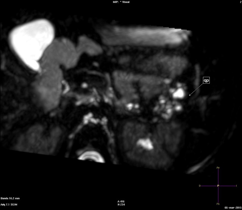 Figura 1. Resonancia magnética en plano axial con secuencia colangiográfica potenciada en T2, en la que se reconocen múltiples quistes hiperintensos en la cola pancreática (marcado con una flecha, y rotulado como "qp")