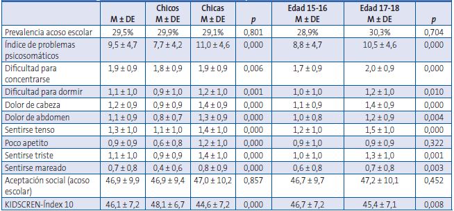 Materials and methods: : we conducted a cross-sectional study in a representative sample of 844 students enrolled in 5 secondary education schools (SESs) in the city of Cuenca (Spain). The main assessment instruments were the social acceptance subscale of the KIDSCREEN-52 (bullying) and the PSP scale (psychosomatic problems).