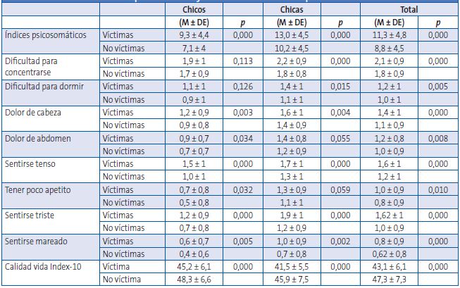 Conclusiones: los problemas psicosomáticos son frecuentes en adolescentes y especialmente entre las víctimas de acoso escolar. Es aconsejable que los profesionales de la salud, especialmente médicos y enfermeras, consideren seriamente la posibilidad de estar ante una víctima de acoso cuando un adolescente exhibe sintomatología psicosomática, especialmente la relacionada con tristeza, dolor de cabeza o de estómago sin causa orgánica aparente.