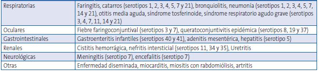 Existe un amplio espectro de enfermedades asociadas a las infecciones por AdvH, dependiendo de los serogrupos, serotipos y de sus diferentes tropismos tisulares: el serogrupo A se ha asociado con el tracto gastrointestinal, el serogrupo B con el tracto respiratorio y algún serotipo a conjuntivitis (AdvH tipo 3), el serogrupo D a conjuntivitis, el serogrupo E con infecciones respiratorias y oculares, pero más comúnmente con conjuntivitis y, por último, los subgrupos F y G son los agentes causantes de la gastroenteritis 4. Las formas graves se han vinculado con los serotipos 7, 5, 21 y recientemente con el 14. No obstante, las manifestaciones clínicas ( Tabla 1) varían según la edad y el estado inmunológico del paciente. Los pacientes inmunodeprimidos tienen un mayor riesgo de enfermedad diseminada y una mayor mortalidad, especialmente los receptores de trasplante de células hematopoyéticas o de órgano sólido 5.