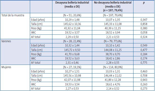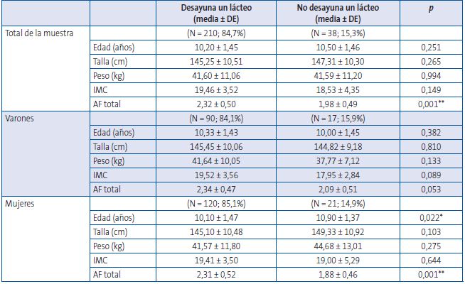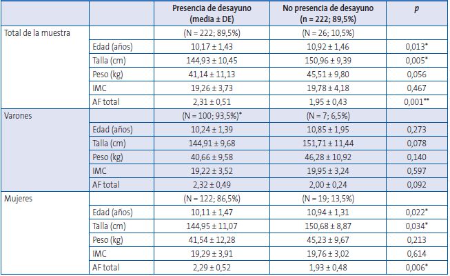 De los 248 escolares (43,1% varones), un 10,5% no toma el desayuno habitualmente: estos escolares obtuvieron mayores promedios en edad ( p <0,013), talla ( p <0,005), menor nivel de AF ( p <0,001) y una tendencia significativa a un mayor peso ( p <0,056). En mujeres, las que consumen desayuno, presentan significativamente menor edad ( p <0,022), talla ( p <0,034) y mayor nivel de AF ( p <0,006). Por su parte, los varones obtienen una mayor prevalencia en desayunar que las chicas (93,5 frente a 86,5%; p <0,021) ( Tabla 1).