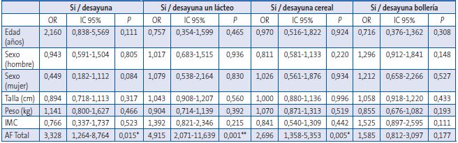 Finalmente, en la Tabla 5 se presentan los resultados de la prueba de regresión logística realizada para evaluar la variable dependiente consumo de desayuno. La ingesta de desayuno ( odds ratio [OR]= 3,3; intervalo de confianza del 95% [IC 95]: 1,2 a 8,7; p <0,015), tomar un lácteo (OR = 4,9; IC 95: 2,0 a 11,6; p <0,001) y cereal (OR = 2,69; IC 95: 1,3 a 5,3; p <0,005) se asocia con un nivel mayor de AF.