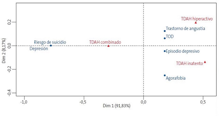 Como se puede observar, las comorbilidades asociadas al subtipo hiperactivo fueron trastorno de angustia y trastorno oposicionista desafiante, mientras que el inatento estuvo relacionado espacialmente con los episodios depresivos y la agorafobia. Es de notar que el subtipo combinado estuvo en la mitad del eje de dispersión, indicando la evidente combinación de los otros dos subtipos (hiperactivo e inatento), en estos pacientes se puede observar que la depresión va de la mano con el riesgo suicida.
