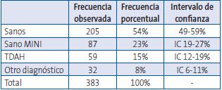 Es de observar que el 8% (IC: 6 a 10) de los sujetos que ameritaron evaluación MINI presentaron criterios para otros trastorno neuropsiquiátricos. Los niños con TDAH y los otros diagnósticos, suman el 23%, es decir, que casi un cuarto de la población evaluada presenta un diagnóstico de alguna patología mental, subrayando que esta es menor de edad.