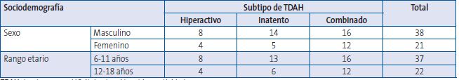 Para el diagnóstico por subtipo, del total de la muestra (n = 59), se encontró que la prevalencia para el subtipo hiperactivo fue del 20%, para el subtipo inatento del 32% y para el subtipo combinado del 47%. No se encontrón una asociación significativa entre los subtipos y el sexo (χ 2: 1,38; p >0,05), así como para los subtipos y el rango etario (χ 2: 0,71; p >0,05).