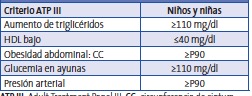 Existen autores que postulan que el comienzo del SM se da en la infancia 7. Es por eso por lo que se han establecido criterios para niños que, si bien difieren entre sí, son útiles en la consulta clínica pediátrica a la hora de determinar factores de riesgo. Dentro de los más usados se encuentran los criterios modificados del ATP III 8, de la Organización Mundial de la Salud (OMS) 9 y la International Diabetes Federation (IDF) 10. Algunos de los trabajos de investigación más usados en estudios epidemiológicos y que han aportado datos en referencia a la modificación de valores de adultos de ATPIII son los de Cook 11, Ferranti 12 y Weiss 13.