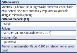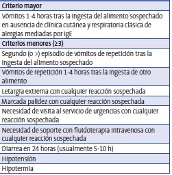 La mediana de edad de presentación del primer episodio de FIPES está en los 4-6 meses, sin embargo, el diagnóstico suele retrasarse varios meses (mediana de seis meses) 3. El diagnóstico es clínico y tiende a hacerse cuando el niño y ha presentado 3-4 episodios con un mismo desencadenante ( Tabla 1). Aunque el diagnóstico es clínico, puede apoyarse en la realización de una prueba de tolerancia oral en el hospital ( Tabla 2). Los valores predictivos positivo y negativos de la PTO se desconocen por lo que el valor de esta es limitado y relativo.