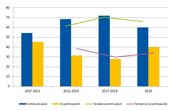 Durante los años 2007-2011 las presentaciones en el apartado PEH-AP, sin participación de los CS, suponía un 45,5%. Este porcentaje fue disminuyendo hasta 2017-2018, en el que fue de un 28%. Al dejar de participar la AEPap, en el 2019 ha vuelto a aumentar casi a niveles previos, concretamente hasta el 40% de las presentaciones de la sección PEH-AP como puede verse en la Fig. 1.