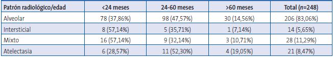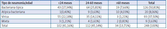 Resultados: se registraron 248 casos de neumonía, con una media de edad de 37,60 ± 2,20 meses, siendo significativamente mayor en neumonías bacterianas típicas (41,98 ± 37,46) y atípicas (73,43 ± 41,28) frente a las víricas (23,30 ± 19,07) ( p <0,0001 y p = 0,0004 respectivamente). La neumonía más frecuente fue la de probable origen neumocócico (47,6%; intervalo de confianza del 95% [IC 95]: 41,84 a 54,18) mientras que el agente identificado con más frecuencia el virus respiratorio sincitial (34,65%; IC 95: 26,93 a 43,26). La odds ratio de presentar patrón radiológico alveolar en neumonías bacterianas frente a víricas fue de 2,98 (IC 95: 1,50 a 5,91; p = 0,0013). El antibiótico más utilizado fue ampicilina intravenosa (62,87%), siendo la duración mayor en las neumonías típicas bacterianas.