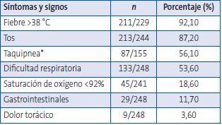 En la Tabla 2 se presentan los síntomas y signos más frecuentes al diagnóstico. El signo más frecuente fue la fiebre, presente en el 85,1% (IC 95: 80,1 a 89,0), con una media de temperaturas máximas de 39,04 ± 0,91 °C y una duración media al diagnóstico de 3,88 ± 2,74 días. La temperatura máxima media fue significativamente mayor en pacientes con neumonía vírica (39,28 ± 0,77 °C) que con neumonía bacteriana típica (38,92 ± 0,96 °C): DM: 0,36 °C; IC 95: 0,12 a 0,59; p = 0,0031, o con neumonía bacteriana atípica (38,55 ± 0,94 °C): DM: 0,73 °C; IC 95: 0,34 a 1,12; p = 0,0004).